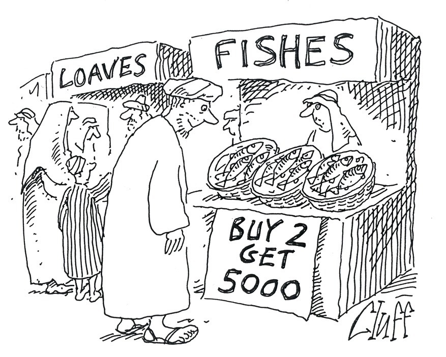 You find a skinny old man who hasn’t yet been served by the others. He looks so hungry and thin, you don’t have the heart to deny him. You break off a big piece of fish, and tear your loaf of bread in half, and give it to him. Next is a young man, at the age where one is hungry all the time. You give him some, and he asks for more. You tear off some more, surprised there is any left. As you go through the crowd, it dawns on you. No matter how much you hand out, you still have plenty left to give the next person.